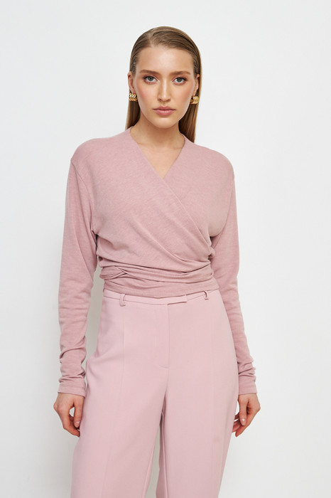 Джемпер свободного силуэта из эластичного полотна. На детали полочки цельнокроеные длинные завязки. Вырез глубокий, V-образный. Втачной рукав в спущенную пройму. Длина джемпера до линии талии.