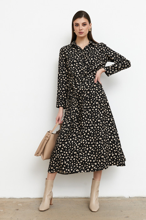 Платье полуприлегающее в области груди и свободное в области бедер из вискозной ткани. Изделие отрезное по линии талии. Лиф с застёжкой на пуговицы. Вырез горловины обработан отложным воротником на стойке. Втачной длинный рукав. В комплекте пояс из основной ткани.