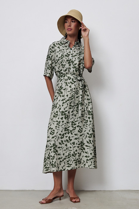 Платье полуприлегающее в области груди и свободное в области бедер из вискозной ткани. Изделие отрезное по линии талии. Лиф с застёжкой на пуговицы. Вырез горловины обработан отложным воротником на стойке. Втачной короткий рукав. В комплекте пояс из основной ткани.