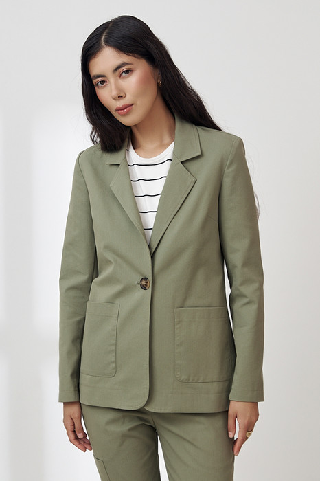 Жакет прямого силуэта с английским воротником из хлопковой ткани. На передней части жакета застежка на пуговицу и накладные карманы. Втачной длинный рукав. Изделие имеет четкую линию плеча благодаря плечевым накладкам.