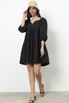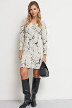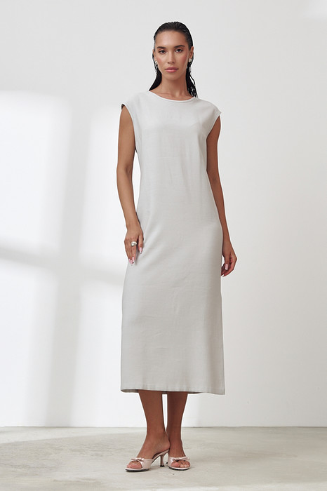 Платье из вискозной ткани с крэш-эффектом. Полуприлегающий силуэт, с разрезом в боковом шве. По среднему шву спинки застёжка на петлю-пуговицу. Круглый вырез горловины и линия проймы окантованы косыми бейками из основной ткани.