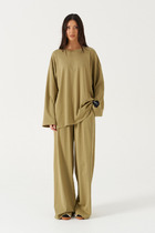 Брюки прямого свободного силуэта из вискозной ткани с крэш-эффектом. Пояс притачной с эластичной резиной, в боковых швах карманы.