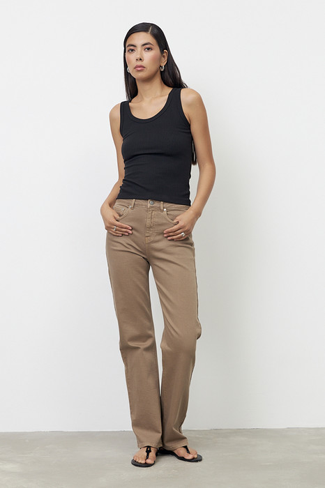 Брюки из эластичного денима выполнены по классической джинсовой технологии. Прямой классический крой. На задней части брюк выполнены накладные карманы, на передней - карманы с подкройным бочком. Притачной пояс со шлёвками. Застёжка на молнию-гульфик и пуговицу.