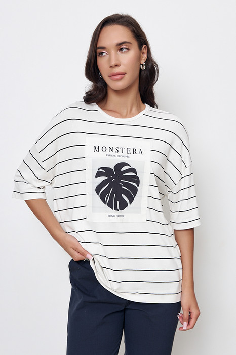 Джемпер из эластичного полотна. Свободный силуэт со спущенной линией плеча и рукавом до локтя. Вырез горловины окантован эластичной бейкой. На передней части изделия выполнена аппликация. В таблице размеров представлены параметры человека, а не изделия.