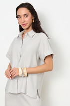 Эффектное платье прямого силуэта, чуть расширенное книзу из вискозной ткани с крэш-эффектом. Рукав оригинального кроя, низ рукава присборен на резинку. По переду и спинке изделия выполнена V-образная кокетка со сборкой в области плеча. Круглый вырез горловины, по среднему шву спинки застёжка на петлю-пуговицу. В комплекте пояс из основной ткани.