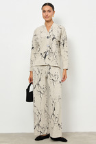 Платье из вискозной ткани с крэш-эффектом полуприлегающего силуэта. По центру передней части изделия выполнен шов, снизу разрез. V-образный вырез горловины и линия проймы оформлены косыми бейками.