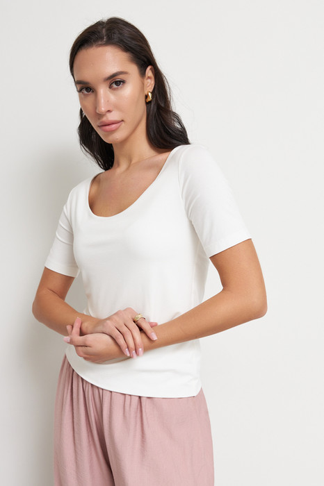 Двухслойный джемпер полуприлегающего силуэта из вискозного эластичного полотна. Втачной короткий рукав, круглый вырез горловины. Благодаря двухслойности переда и спинки изделие скрывает мелкие недочёты фигуры и делает силуэт более ровным. Актуальный джемпер придаст совершено особое звучание и строгим классическим брюкам, и нарядной юбке и даже спортивному костюму. Его легко применять для создания разных образов.