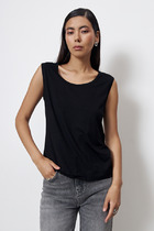 Топ из вискозной ткани с сатиновым блеском. Свободный силуэт, с небольшими разрезами в боковых швах. Круглый вырез горловины и линии проймы окантованы косыми бейками из основной ткани.