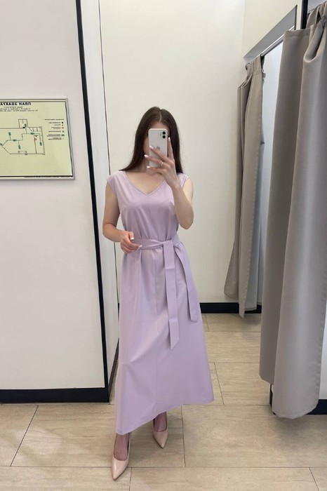 Платье полуприлегающего силуэта, чуть расширенное книзу из вискозной плательной ткани. По центру передней и задней части изделия выполнен шов. V-образный вырез горловины и линия проймы оформлены косыми бейками. Низ изделия асимметричной длины (спинка чуть удлинена относительно переда). В боковых швах карманы с настроченным контуром. В комплекте пояс из основной ткани.