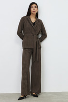 Брюки прямого силуэта из эластичного полотна. Пояс притачной с эластичной резиной. На передней части брюк застрочены стрелки.