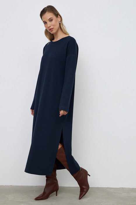 Платье из эластичного полотна свободного силуэта с разрезом в боковом шве. Изделие со спущенной линией плеча и длинным рукавом. Вырез горловины оформлен бейкой из основной ткани. В таблице размеров представлены параметры человека, а не изделия.