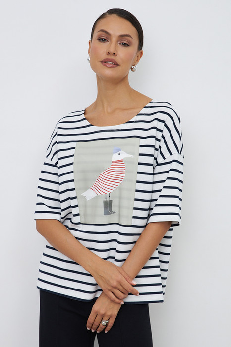 Джемпер свободного силуэта со спущенной линией плеча и рукавом до локтя выполнен из эластичного полотна. Круглый вырез горловины. На передней части изделия выполнена аппликация. В таблице размеров представлены параметры человека, а не изделия.