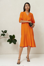 Платье из эластичного полотна прилегающего силуэта. Оригинальный крой с перекрутом на передней части изделия, снизу разрез. Глубокий V-образный вырез горловины. Втачной длинный рукав.