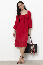 Платье свободного силуэта из вискозной плательной ткани. Изделие отрезное по линии бедра. Верхняя часть юбки со сборкой. Втачной длинный рукав. Круглый вырез горловины, сзади застёжка на петлю-пуговицу. В таблице размеров представлены параметры человека, а не изделия.