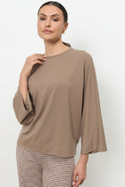 Джемпер из вискозного эластичного полотна свободного силуэта. Изделие оригинального кроя с цельнокроеным рукавом. Круглый вырез горловины и линия проймы окантованы эластичными бейками.