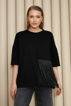 Джемпер свободного силуэта со спущенной линией плеча и рукавом до локтя выполнен из эластичного полотна. Вырез горловины оформлен бейкой из основной ткани. На передней части изделия накладной карман с декоративной бахромой. В таблице размеров представлены параметры человека, а не изделия.