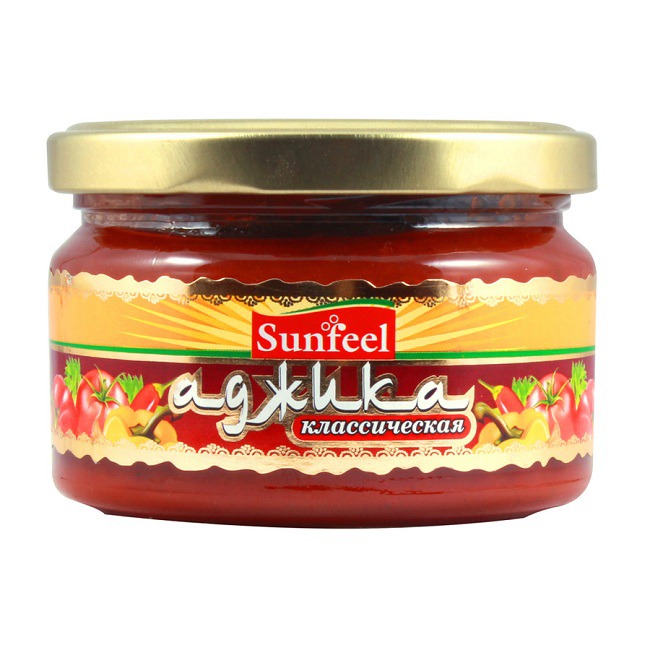 Пожалуй, лучшей приправой к мясу является аджика. Жгучая, пряная, она раскроет вкус мяса и придаст ему пикантности, также ее можно добавлять в качестве соуса практически к любому блюду. Аджика изготавливается из сухого красного перца и различных сушенных приправ, в классичсекую аджику добавляется томатная паста. Аджика классическая SunFeel - натуральный и вкусный продукт.