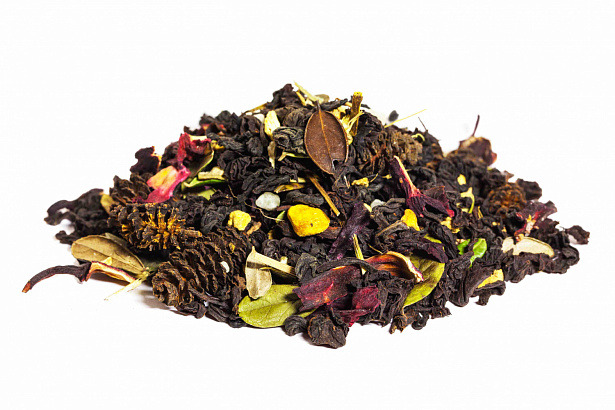 Состав: чай чёрный, кусочки имбиря, медовые гранулы, гибискус, ягоды клюквы, эхинацея, шишки ольхи, лист брусники. Без ароматизаторов.