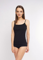 Топ на тонких регулируемых бретелях. Модель выполнена из мягкой эластичной микрофибры, со съемными чашками, при необходимости, вкладыши можно убрать.
