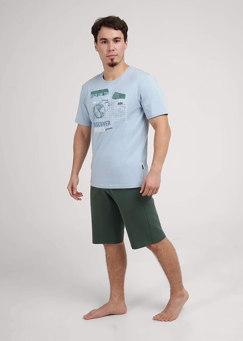 Комплект мужской для дома состоящий из футболки и шорт. Футболка из трикотажного полотна с круглым вырезом горловины, коротким рукавом и стильным принтом. Шорты из плотного трикотажного полотна на эластичном поясе с функциональными карманами и шнуром.