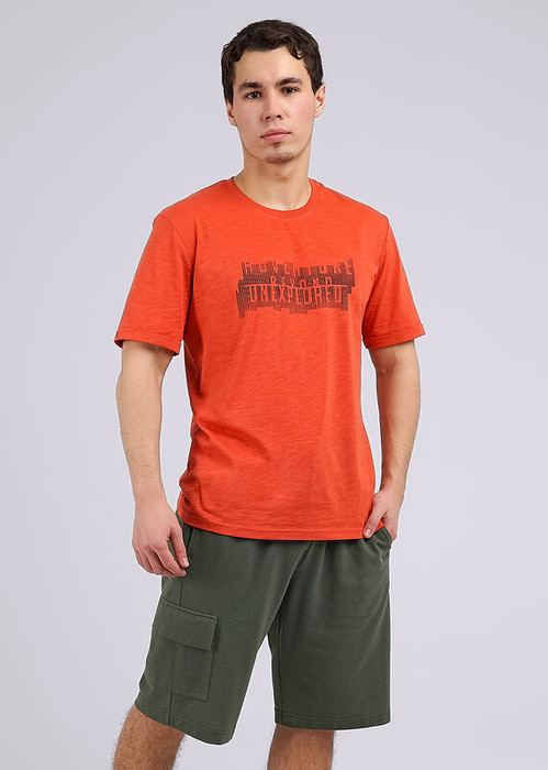 Комплект мужской для дома, состоящий из футболки и шорт. Футболка из флама с круглой горловиной, с короткими рукавами с загибом и стильным шрифтовым принтом. Шорты из пике на эластичном поясе дополнены шнуром и функциональным накладным карманом.