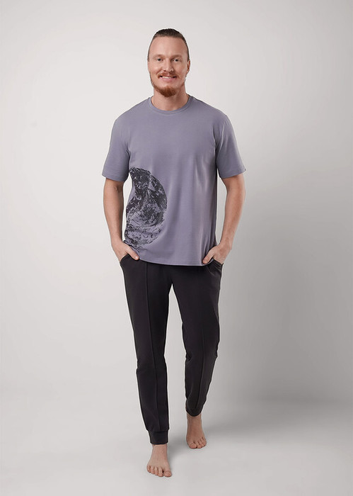 Комплект мужской, состоящий из футболки и брюк. Футболка из трикотажного полотна с коротким рукавом, спереди авторский принт. Брюки с защипами из трикотажного полотна на широком поясе с резинкой и регулируемым шнуром, по бокам удобные карманы.