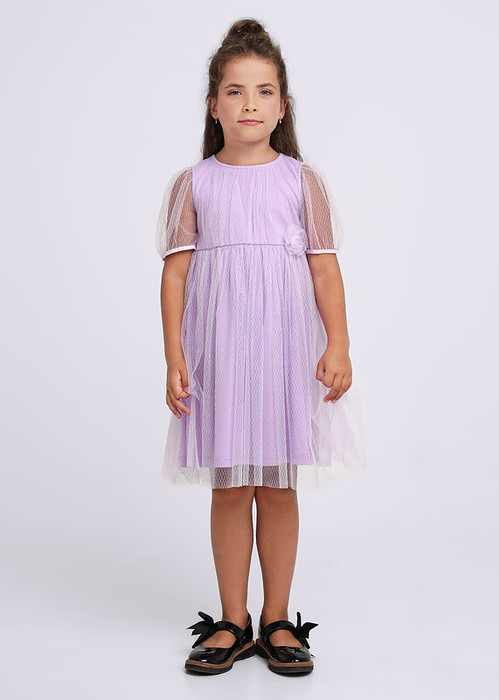 Нарядное двухслойное платье для девочки. Объемные рукава выполнены из сетки с узором. Нижний слой платья - из кулирки 100% хлопок, верхний слой - из сетки, как на рукавах. Сзади платья функциональная атласная лента.