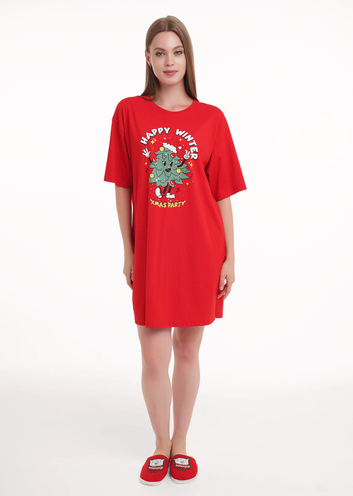 Платье для дома и отдыха из хлопкового трикотажного полотна прямого кроя, длиной до колена. Короткий втачной рукав. Округлая горловина с обтачкой. Спереди принт.