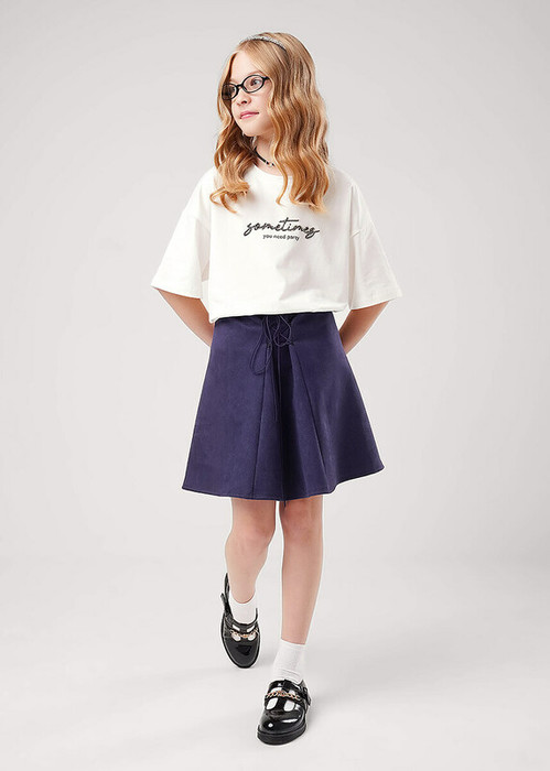 Юбка клиньями, расширенная к низу, выполнена из экозамши. Впереди шнуровка по линии бедер. Пояс обработан широкой эластичной тесьмой.