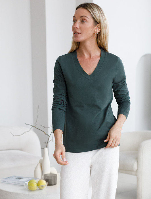 Состав: 92%Хлопок 8%ПУ Параметры модели на первом фото: Рост 170, бюст 89, талия 63, бедра 92Оливковый джемпер с длинными рукавами и V-образным вырезом сшит из премиального хлопка. Однотонная хлопковая модель хорошо поддерживает комфортный для тела микроклимат. Благодаря вплетению эластановых волокон вещь хорошо сохраняет форму.