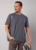 Футболка мужская из гладкокрашеного трикотажного полотна "кулирка", свободного покроя, со спущенным плечом и втачными короткими рукавами. Горловина овальной формы обработана втачной планкой. По шву втачивания планки настрочена двойная отделочная строчка. В центре переда - принт, выплненный в технике шелкографии.
