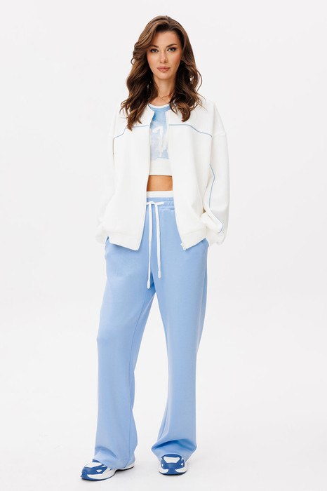 Костюм женский 2-ух предметный. Состоит из бомбера и брюк. Бомбер спортивный прямого силуэта с втачным рукавом и спущенной линией плеча, внизу рукав на манжете из довяза. Бомбер по переду с центральной застежкой на тесьму-молнию и карманами с листочкой. По горловине стойка из довяза, по низу бомбера приточная планка из довяза. По переду спинке и рукаву декоративные подрезы с вставленным в него кантом. Брюки спортивные, прямого силуэта на притачном, отстроченном поясе на резинке и втянутым в него декоративным шнуром. Над притачным поясом вставлен довяз. По переду карманы в боковых швах с наклонным входом.