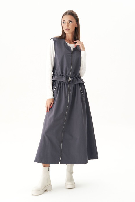 Жилет свободный с центральной застёжкой на тесьму-молнию, кулисой чуть ниже линии талии, неширокой баской. Полочки с отрезной кокеткой и прорезным карманом с листочкой. Кулиса с эластичным шнуром и фиксаторами.