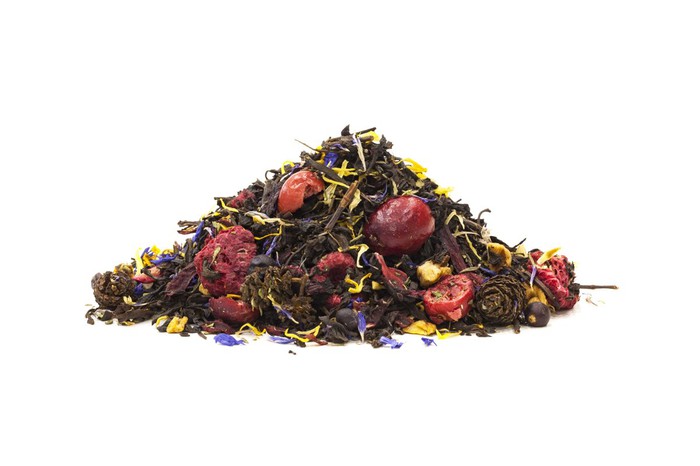 Состав: чёрный чай, чабрец, гибискус, кубики яблока, шишки, мята, ягоды можжевельника, малина сублимированная, облепиха, слайсы клюквы, лепестки мальвы и календулы, ароматизатор.