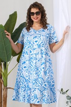 Платье из трикотажного полотна «кулирка» с набивным рисунком, отрезное по талии, с короткими втачными рукавами, горловиной V-образной формы, окантованной основным материалом и карманами в боковых швах. Полочка – с рельефами, выходящими из плечевых швов. Входы в карманы окантованы. Юбка – широкая, присборенная по шву стачивания с лифом и оборкой по низу.