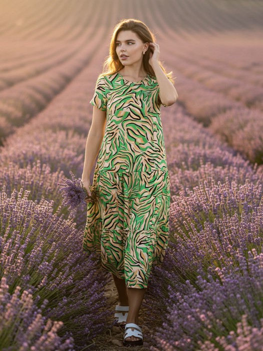 Платье из трикотажного полотна «кулирка» с набивным рисунком, с короткими втачными рукавами, горловиной фигурной формы (сзади V- образная, спереди – овальная), с двумя завязывающимися концам, являющимися продолжением окантовки горловины переда. Юбка – широкая отрезная по линии бедер из двух ярусов, верхний срез присборен.