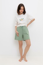 Комфортные шорты на резинке из однотонного футера петли. Регулируются по ширине с помощью шнурка. По бокам удобные карманы. Низ обработан плоскими швами с открытым срезом.