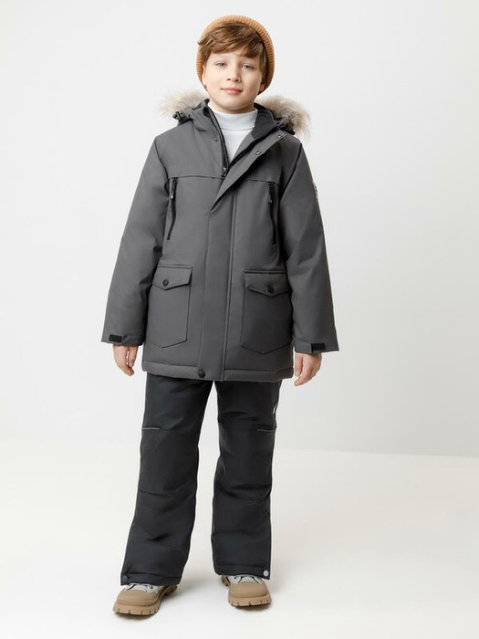 Зимняя куртка для мальчика с утеплителем SEE®: 250 г/м2. Выполнена из мембранной ткани с дополнительной тефлоновой обработкой, которая предохраняет изделие от загрязнений и отталкивает влагу. Подклад выполнен из 100% полиэстера Tricot. Куртка застёгивается на молнию и внешнюю планку с металлическими кнопками, предусмотрена защита подбородка. Съёмный капюшон на кнопках и липучках имеет эластичную утяжку со стопперами и отстёгивающуюся опушку из искусственного меха, регулируется по глубине. На рукавах внутренние эластичные манжеты, ширина рукава регулируется при помощи липучки. По бокам два накладных кармана и два кармана с молниями на груди. По талии эластичная утяжка со стопперами. Во всех изделиях верхнего ассортимента для безопасности ребёнка предусмотрены светоотражающие элементы.