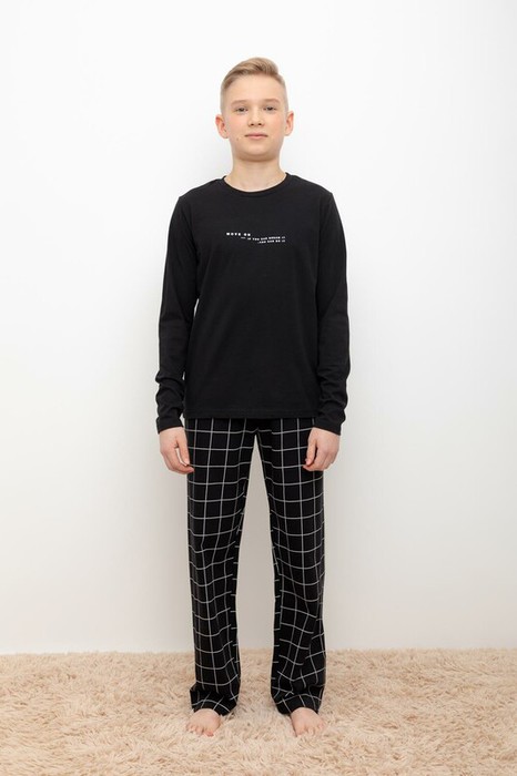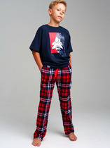 Трикотажный пижамный комплект из натурального хлопка. У джемпера длинные втачные рукава. Брюки с удобным поясом на резинке и утягивающим плетеным шнуром. Оригинальная набивка выполнена из стойких, гипоаллергенных текстильных красителей. Все трикотажные полотна производятся в соответствии с нормами Швейцарского сертификата ЭкоТекс.