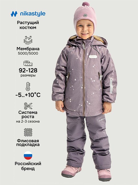 Костюм ЗВЕЗДА с системой роста на один размер (длина рукавов и брючин увеличивается на 4-5см).Костюм из мембранной ткани 5000/5000 с водо- грязеотталкивающей технологией TEFLON. Мембранная ткань - это непродуваемый и водонепроницаемый материал, который надежно защищает от ветра и влаги. Благодаря дышащим свойствам мембраны ребенку будет комфортно в любую погоду и он не вспотеет. Ткань обработана снаружи экологически чистым протектором TEFLON для защиты от воды и грязи .Мембрана в сочетании с утеплителем нового поколения FIBERlite сохраняет тепло во время прогулок, позволяя телу дышать. Флисовая подкладка отводит влагу и имеет хорошие теплоизоляционные свойства.  Функционал: - центральная застежка и карманы на молнии, - ветрозащитная планка, - капюшон с кулисой для регулировки объема, - резинка на спинке для создания силуэта, - манжеты на резинке, - внутренняя сторона манжета из флиса, - внутренние бретели для возможности снять куртку в помещении. Мы все продумали до мелочей, поэтому полукомбинезон дополнительно оснащен:- регулируемыми бретелями, - удобными карманами, - снегозащитными муфтами, - силиконовыми штрипками, - светоотражающими элементами для безопасности ребенка в темное время суток.Область колен и шов сидения проклеены.В костюме предусмотрена СИСТЕМА РОСТА. Удлинить рукава и штанины можно, удалив строчку на подкладке и костюм подрастет вместе с ребенком.Комфортная температура эксплуатации от -5°С до +10°С. Рекомендуем приобрести комплектом аксессуары, обувь и другие вещи из капсулы в карточке товара, которые отлично сочетаются с изделиями коллекции