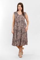 Сарафан женский из тканого штапельного полотна с набивным рисунком, удлиненный, слегка расширенный книзу, с широкими бретелями, глубоким вырезом горловины, центральной бортовой застежкой на обметанные петли и пуговицы, карманами и разрезами в боковых швах. На полочках - вытачки в области груди. Изделие укомплектовано съемным поясом, завязывающимся вокруг талии.