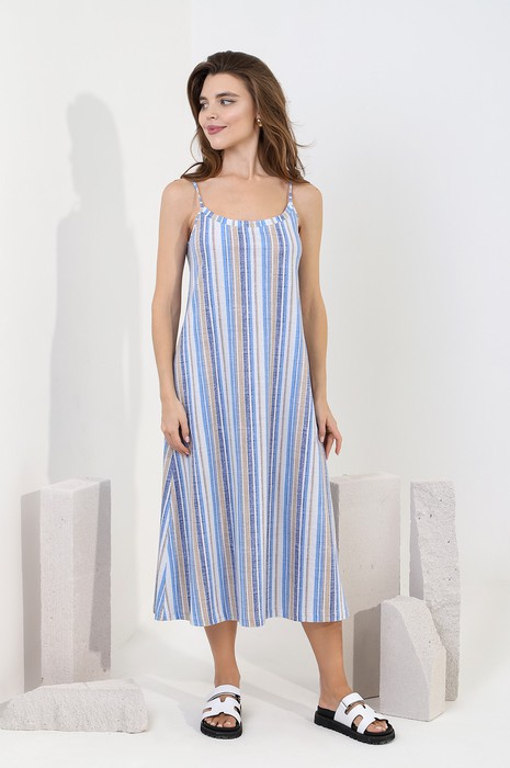 Сарафан молодежный из трикотажного полотна «кулирка» с набивным рисунком в полоску, полуприталенного силуэта на тонких бретелях, с карманами в боковых швах. Вырез горловины полочки и спинки обработаны притачной планкой из основного материала, проймы окантованы.