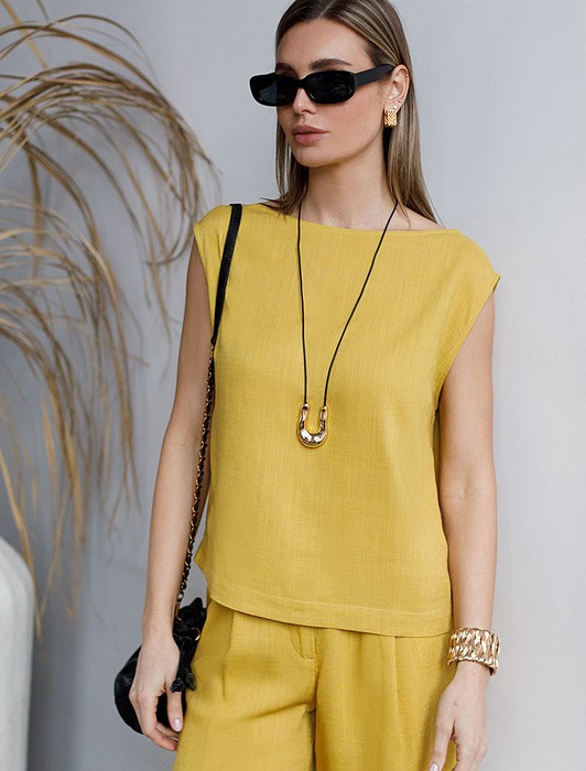 Состав: 70%Вис 30%Лен Параметры модели на первом фото: Рост 170, бюст 89, талия 63, бедра 92Лаконичный топ выполнен изо льна с вискозой. Изделие с горловиной формы лодочка, без застежек. Лён в составе обеспечивает прочность и воздухопроницаемость, вискоза эластичность и гладкость ткани. Благодаря такому сочетанию изделие хорошо драпируется, меньше мнется и сохраняет форму в течении долгого времени. Сочетается в костюме с брюками D24.222 и шортами D28.052