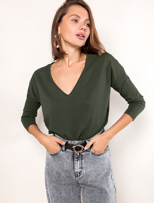Оливковый джемпер с длинными рукавами и глубоким V-образным вырезом сшит из премиального хлопка. Однотонная хлопковая модель свободного кроя хорошо поддерживает комфортный для тела микроклимат. Благодаря вплетению эластановых волокон вещь хорошо сохраняет форму.