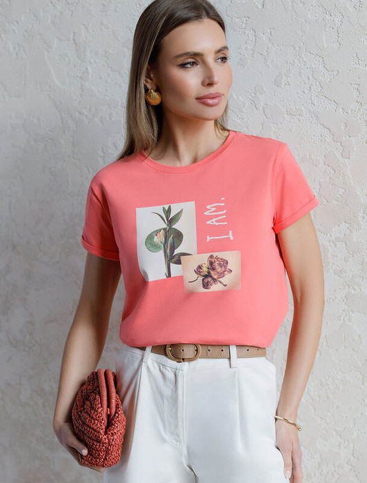 Совместные покупки Челябинск Женская одежда Футболки — Акция Vilatte Футболка из эластичного хлопка с принтом стразы D49.097 коралловы