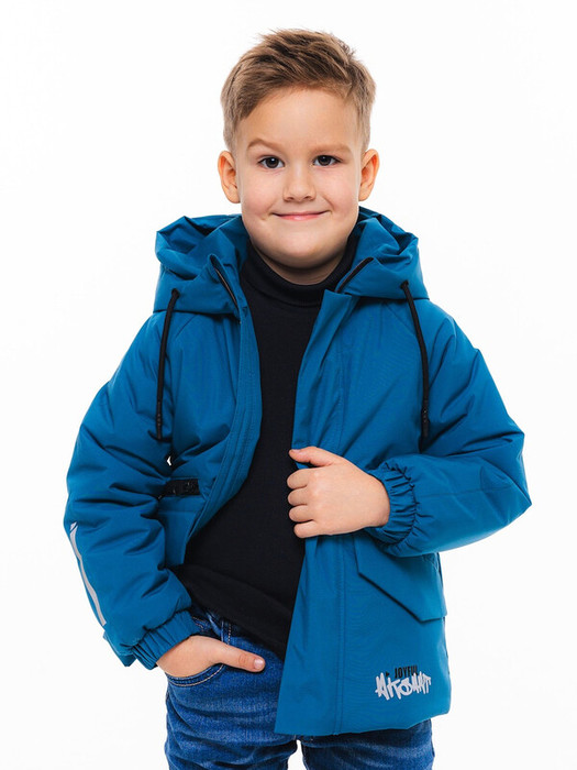 Куртка для мальчиков из тонкой мембранной ткани. Подкладка из флиса. Рукав-реглан. Вход в карманы закрыт большими клапанами зафиксированными в боковом шве. Над клапаном левого кармана, прорезной карман с молнией. Фронтальная молния закрыта широкой ветрозащитной планкой. Планка фиксируется кнопками. Манжеты рукавов обработаны эластичной тесьмой. Несъемный капюшон. Регулировка лицевой части капюшона  выполнена с помощью кулисы со шнуром. Вся фурнитура лаконичного черного цвета. В поддержку — черный и светоотражающий термопринт на спинке и в нижней части левой полочки. На правом рукаве светоотражающий термопринт.Характеристики:Ткань верха: Fitsysem style 1202Подклад: х/б / полиэстер