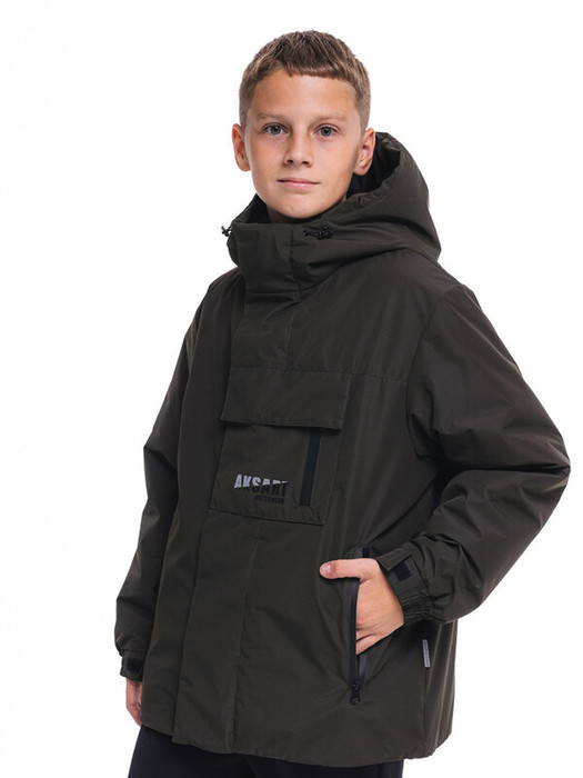 Однотонная стильная куртка для мальчиков. Ткань с отделкой рип-стоп. Подкладка трикотаж-интерлок (хлопок 100%). Вся фурнитура лаконичного черного цвета. Фронтальная молния под широкой ветрозащитной планкой. Планка фиксируется кнопками. Оригинальный нагрудный накладной карман куртки выполнен с заходом на ветрозащитную планку, что создает иллюзию ассиметричной фронтальной застежки. Вход в карман закрыт клапаном. На этом кармане дополнительно выполнен прорезной карман с молнией. На молниях и боковые карманы куртки. Манжеты рукавов обработаны эластичной тесьмой и патами с лентой-«велькро». Несъемный капюшон. Регулировка лицевой части капюшона и низа куртки  выполнена с помощью кулисы со шнуром-резинкой и фиксаторами. На накладном кармане и правом рукаве куртки светоотражающий термопринт, в боковом шве светоотражающий флажок.Характеристики:Ткань верха: курточная с отделкой Rip stop WR PUПодклад: хл / п/эУтеплитель: слайтекс 100 г/кв.м