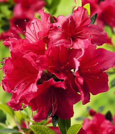 Компактный кустарник. Цветки карминно-розового цвета весной и красного цвета летом