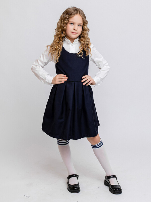 Сарафан для школы синий с боковыми карманами в швах и складками на талии. Круглый вырез позволяет надевать блузки разного стиля. Выполнен из костюмной ткани, состоящей из полиэстера, вискозы и эластана. Характеристики:Ткань:Костюмная ткань полиэстер 77%, Вискоза 19%, эластан 4%Производитель: Batik