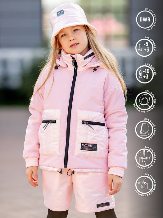 Куртка для девочки Вера демисезонная розовая с утеплителем. Материал с ветро- и водоотталкивающим покрытием. Украшена нашивками с надписями. Съемный капюшон регулируется с помощью шнурка-кулиски со стопперами. Центральная застежка на молнию с защитой подбородка.   Особенности:  Съемный регулируемый капюшонСпущенная линия проймыКарманы с вертикальной и горизонтальной молниейСовмещение матовой ткани и ткани с металлизированным эффектомРегулировка по низуСветоотражающие элементыЭластичные манжеты рукавов Характеристики:Ткань верха: Twill stretch (мембрана) Подклад: T/CУтеплитель: 150 гр Температурный режим от +10 до -5 СПроизводитель: batik